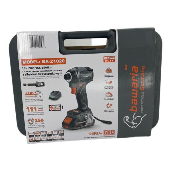 Komplektacija: baterinis smūginis suktuvas BA-Z1020, 2 x MT1821 baterijos, M18-S40 kroviklis, perėjimas 1/2" galvutėms, sukimo antgalis, kablys įrankio tvirtinimui prie diržo, naudojimo instrukcija, plastikinis lagaminas.