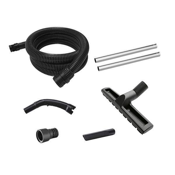 Komplektacija: dulkių siurblys, 1 x 2500 mm žarna, 1 x plastiknė rankena, 2 x plastikiniai 505 mm ilgio vamzdžiai, 1 x 225 mm antgalis grindims su šeriais, 1 antgalis sunkiai prieinamoms vietoms, perėjimas įrankių jungimui, FBV22 plastikinis maišas, naudojimo instrukcija, kartoninė dėžė.