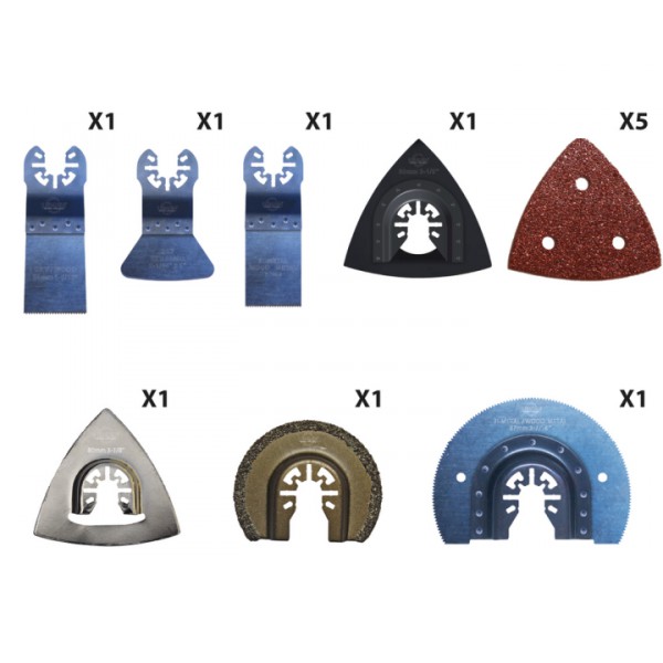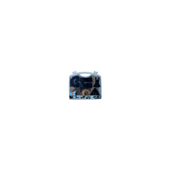 Komplektacija: 32 mm įpjovimo geležtė medienia/metalui; 87 mm diametro pjovimo geležtė medienai/metalui; 52 mm geležtė plytelių nuėmimui; 65 mm diametro pjovimo geležtė keramikai; 80x80x80 mm deimantinė lėkštutė betono šlifavimui; 80x80x80 mm velcro šlifavimo padas šlifavimo audiniui; 80x80x80 mm šlifavimo popierius Nr.40/60/80/100/120 po 1 vnt. ); plastikinis užsegamas dėklas.